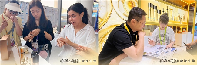 展会上,首发新品渼黛思肌密御龄X肌润修护系列,引发中外消费者纷纷驻足体验。该系列覆盖抗老与修护两大领域,包含洁面、水、精华、乳液、面霜等共7款单品,全方位满足精致奢护需求。与此同时,ichembio推出的三款新品基础焕能版、进阶多维靶向版和顶奢再生版,满足从日常精力管理到深度逆龄修复的全周期抗衰需求。凭借前沿的生物科技理念与出色的产品功效,众多国内外代理商主动前来洽谈合作,他们高度认可品牌实力,并对市场潜力展现出浓厚兴趣。